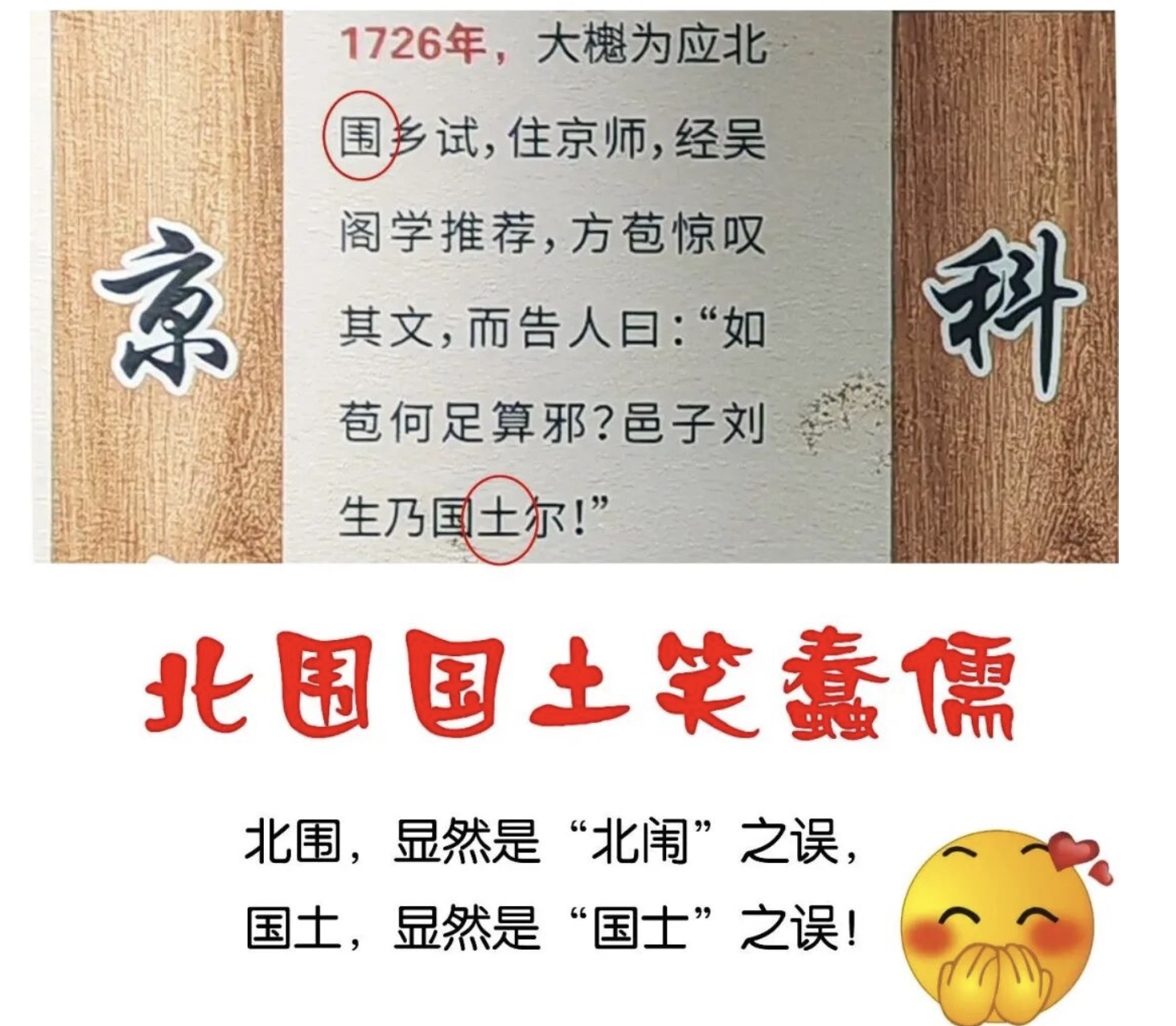 发文挑错的是枞阳当地文史研究者陈先生。他在第一篇长文中详细列举了数十处文字错误,其中包括书法字体引发误读、人名错误,古文词语中掉字、多字问题,以及“国士”还是“国土”,“授徒”还是“授徙”,“北围”还是“北闱”等文学字词常识问题。